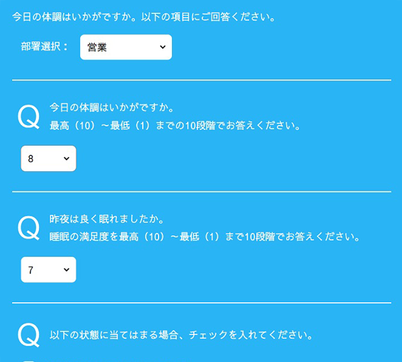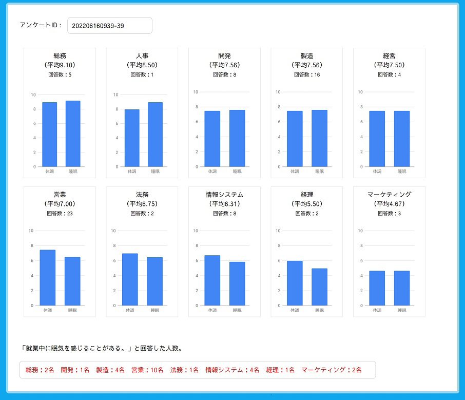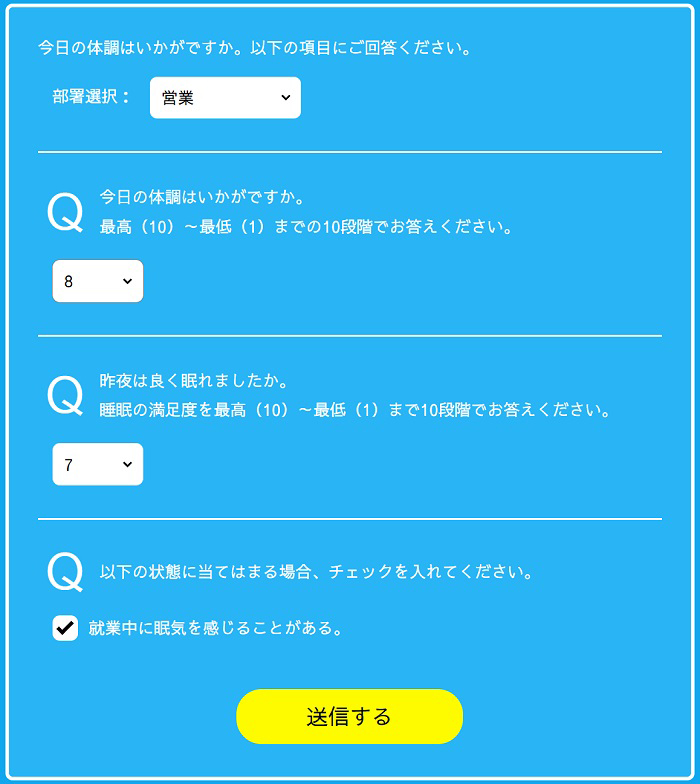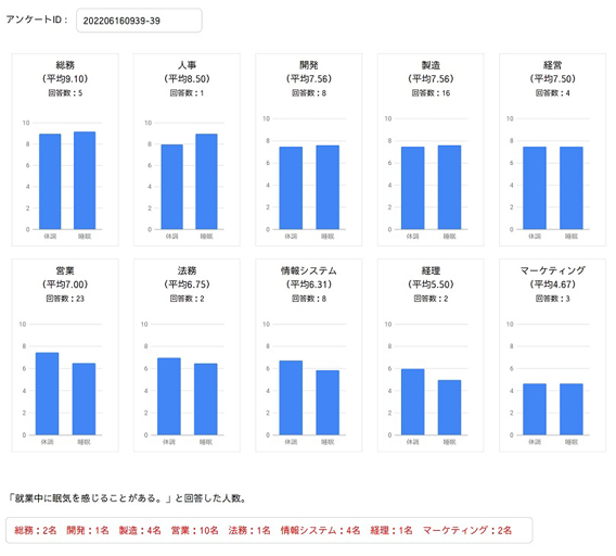 仕事の生産性を上げる鍵は集中力であり、集中力の源泉は睡眠にあると当社では考えています。また十分な睡眠時間が体調を整えることにもつながります。始業前に体調と睡眠の2つを10段階で入力することが、体調と睡眠を意識した生活を送るきっかけとなり、仲間や同僚と一緒に取り組むことで習慣化しやすくなります。また管理職には自分の部署のスコアを改善するように促すことができます。